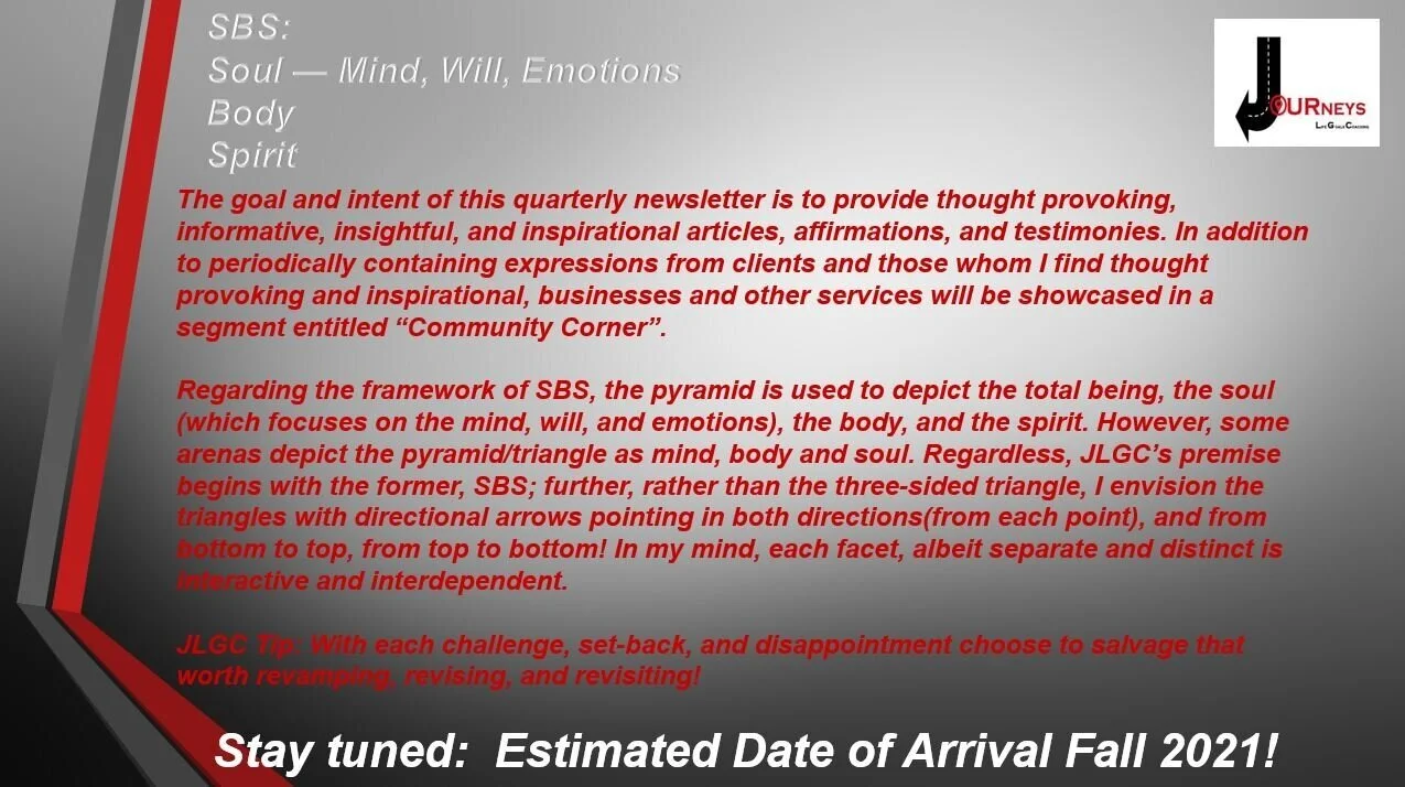 Life is a journey and you are in control of your direction and destination! Loving each moment and living life to the fullest can be a cliche or your reality. If you: have reached a fork in the road; are experiencing an unexpected change; are making a major transition (marriage, career, retirement, divorce, relocation, etc.); or are sick and tired of being sick and tired, JLGC is for you! In the athletic arena, coaches are viewed as essential components in the development and re-empowerment of major athletes. Coaches, by nature, motivate and encourage others to fulfill their potential while honing a skill and/or talent. A life coach can provide similar assistance in your personal and/or professional life. In conjunction with JLGC, you can access, reset and reach life goals previously dismissed, deferred, or dreamed.